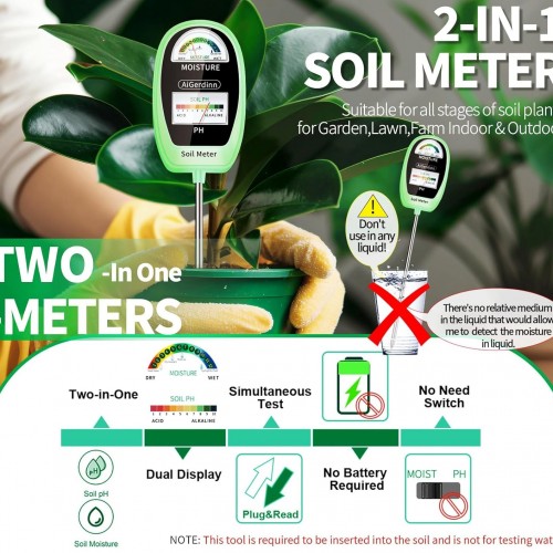 2-in-1 Soil Test Kit, Soil Moisture Meter, Soil pH Tester-Dual Dial-Simultaneously-Display Results-Soil pH Meter, Moisture Meter for House Plants,Lawn,Garden,Farm Indoor&Outdoor-BabyGreen