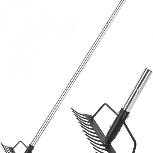 15 Inch Wide Bow Rake, 16 Steel Tines Metal Head Rake Tool with Stainless Steel Handle, Adjustable Long Handle Garden Rake for Loosening Soil Leveling Mulch Gathering Lawns Leaves