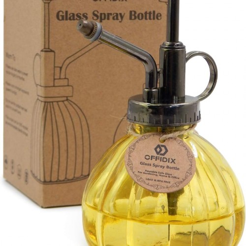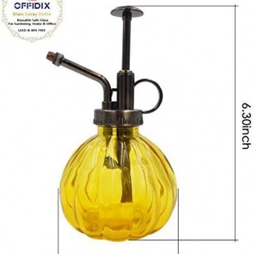 OFFIDIX Yellow Glass Watering Can Indoor, 6.3″ Tall Vintage Style with Bronze Plastic Top Pump One Hand Spray Bottle