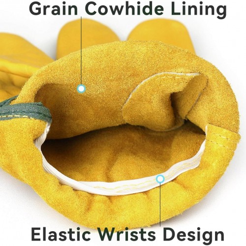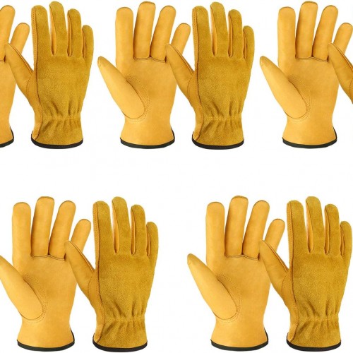 OZERO 5Pair Leather Work Gloves Cowhide Garden Glove for Wood Cutting/Yard Gold,Large