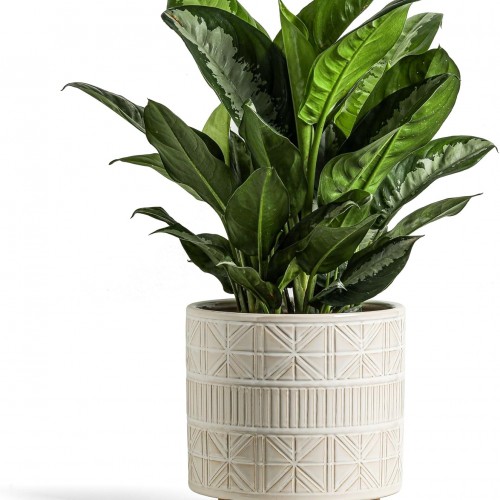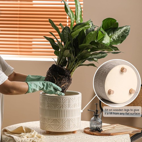 Ceramic Plant Pot with Foots: 10 Inch Planter with Wooden Legs – Large Pots for Indoor Plants – Modern Flower Pot for Home Office Patio Garden Windowsill