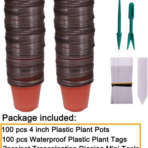100 Pcs 4″ Plastic Seedlings Plants Nursery Pots with 100 Pcs Waterproof Plastic Plant Tags and 2Pcs/Set Transplanting Digging Mini Tools