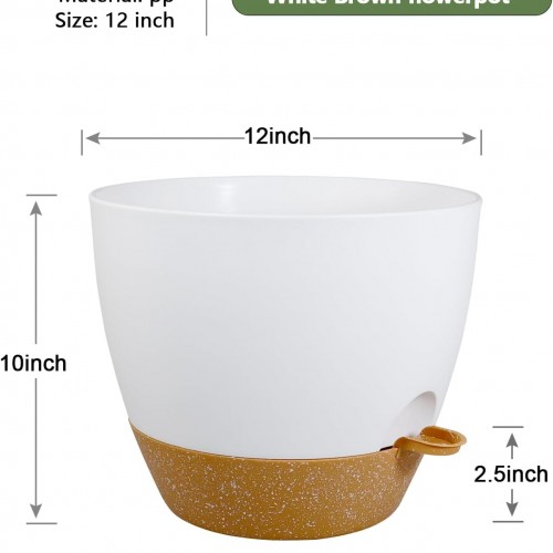 12 inch Large Self Watering Pots, Flower Plant Pots with Drainage Holes for Indoor Outdoor Garden Plants, Plastic Planters with Removable Deep Reservoir, White with Brown