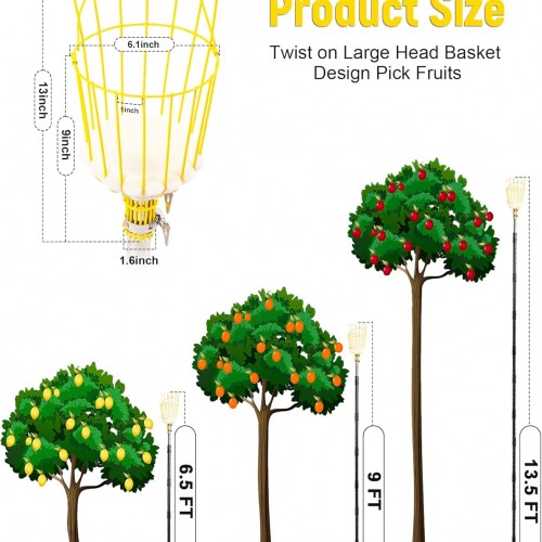 - Length Adjustable: No more dangerous ladders — this apple picker lets you easily reach tall branches. Each pole measures 16”, and the height of the fruit picking tool can be easily adjusted by adding or removing stainless steel pole sections to match different tree heights. Choose from 6.5FT, 9FT, or 13.5FT configurations to suit various needs. Ideal for backyard or orchard use, it offers a safe, labor-saving picking experience with reduced hand fatigue.