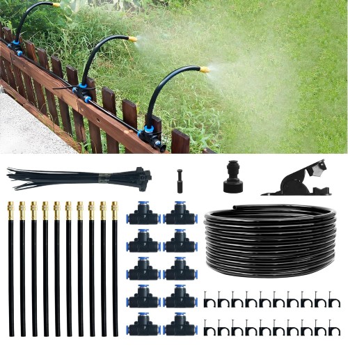 - High Quality: The garden irrigation system are made of durable, high-quality materials. Brass misting nozzle, explosion-proof and rust proof, with good atomization effect. Automatic garden watering misting system with T-joints and 3/4 inch faucet adapter, has better performance in anti-leaking and connection. The water pipe is made of advanced anti-aging materials and has excellent anti-oxidation properties. It can withstand many weather conditions and will not deform or break.