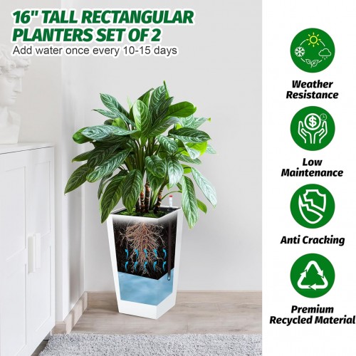 - Water Level Monitor: This set includes two 16-inch elegant planters designed for outdoor plants with two water level monitors. The water level monitors allow you to easily keep track of the amount of water remaining in the pots, and you can easily watch the monitor’s water level line high or low to water, saving you up to two weeks of watering time