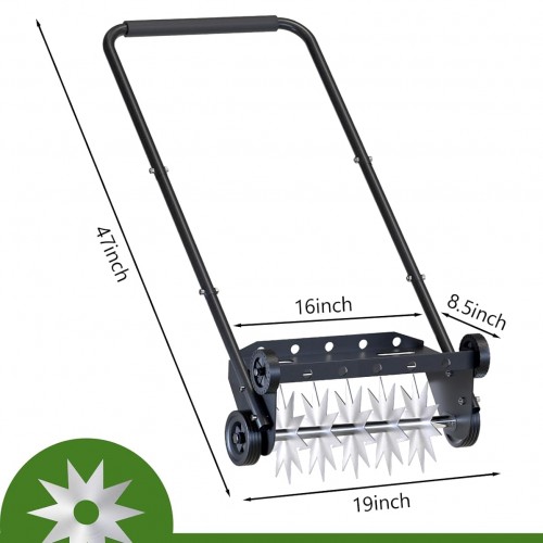 - High-Quality and Durable Materials – 18 Inch push lawn aerator is composed of solid black coated steel pipe, sharp stainless steel coated gears, four wheels, 5MM thickened sponge handrails, widened steel top plate. Push spike lawn aerator can work effectively even in compacted soil, and is also waterproof and rust-proof, achieving more efficient and labor-saving aeration