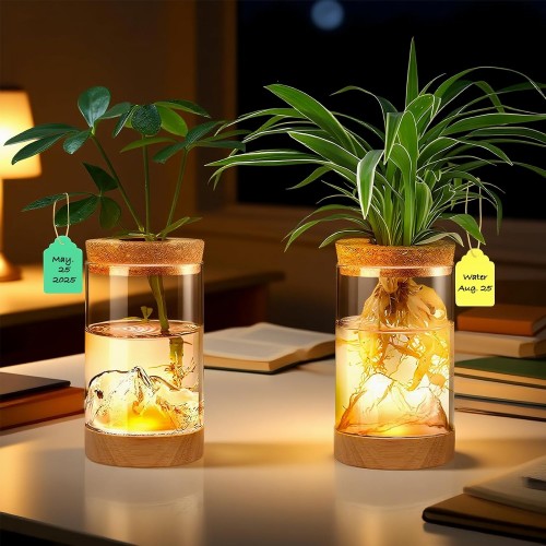 - Luminous Solid Wood Base: Every plant propagation station comes with a premium solid wood base that emits soft warm light. The light not only delivers essential illumination to plant roots in your plant vivarium but also provides gentle heat to boost healthier growth. Powered by USB and controlled via a separate switch, this base lights up the entire propagation vases for plants, elevating both function and ambiance.