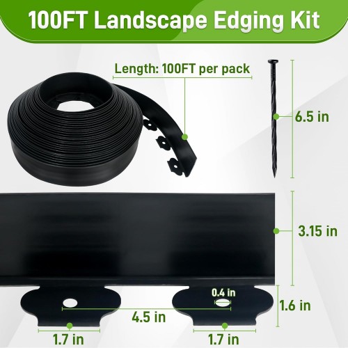 - Size:Quibbay flexible landscape edging is 3.15 inch height and 100 ft length, with 90pcs 6.5 inch spiral edging stakes. Garden edging is great for landscape edging,flower beds, garden pathways, tree rings and grass.
