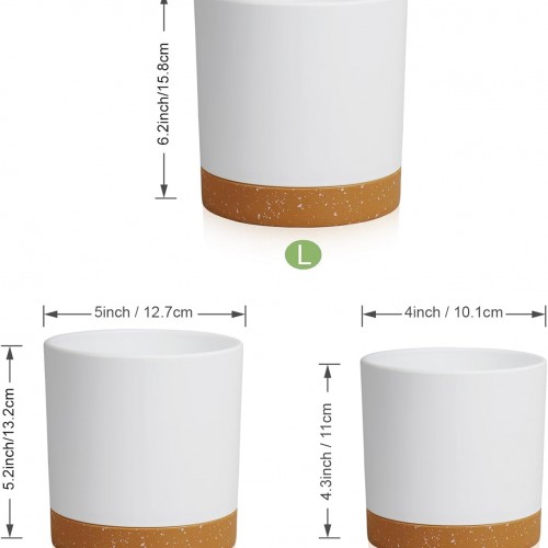 3 Pack 6/5/4 inch Cylindrical Flower Pots, Modern Small Round Plastic Plant Pots with Drainage Holes & Saucers, Clean and Refined Planter Pots for Outdoor, Indoor & Office Decor (White Brown)
