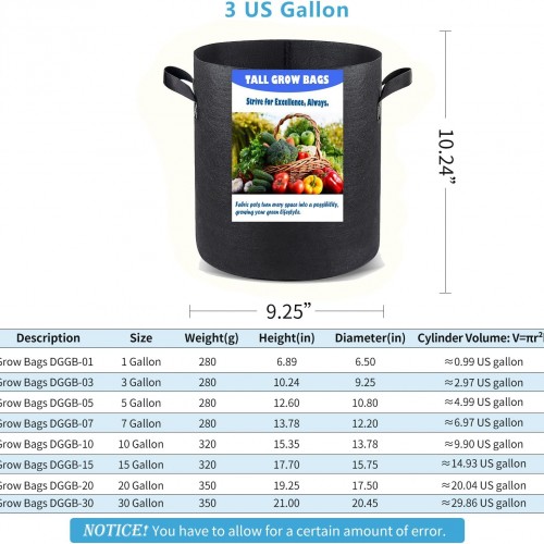 3 US Gallon 8 Pack Tall Grow Bags for Vegetables, Heavy Duty Nonwoven Aeration Fabric Deep Grow Pots with Handles