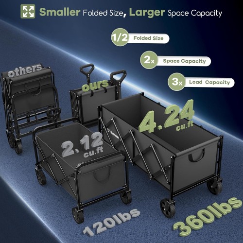 34” Extra Long Collapsible Wagons Carts Foldable, 360LBS Heavy Duty Folding Beach Wagon with Wheels, Portable Utility Outdoor Cart for Grocery, Garden, Sports, Camping, Grey