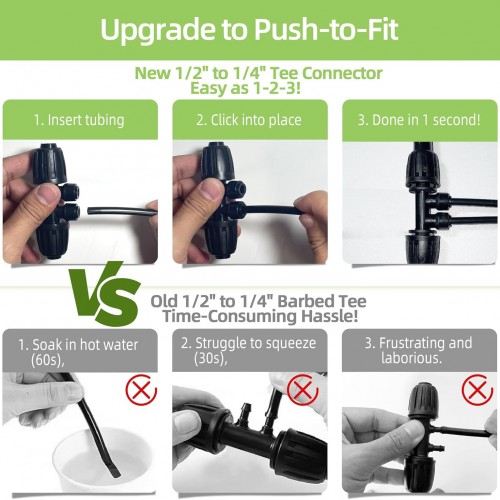 - Quick and Easy Installation: The Push-to-Fit design makes setup a breeze. Simply push the tubing in for a tight, leak-free connection in seconds, eliminating the hassle of traditional 1/2″ to 1/4″ barbed tee connections.