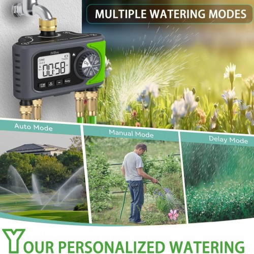 - Multi-Scene Application — This sprinkler timer for garden hose features 4 separate outlets,allowing for independent scheduling and customization of various garden watering tasks.Sprinkler timer is also suitable for controlling lawn sprinklers,automatic drip irrigation systems,outside patio misting cooling,soaker hoses,pool filling,pet drinking stations and more.