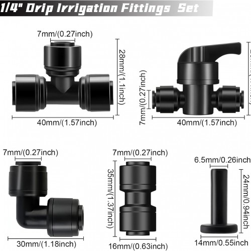 - Package Includes: 10pcs 1/4″ Tee Connectors, 10pcs 1/4″ Coupling Connectors, 10pcs 1/4″ Elbow Coupling Connectors, 5pcs 1/4″ Drip Irrigation Shut Off Valve, 10pcs 1/4″ End Plugs for 1/4″ Quick Connect Drip Irrigation Fittings.