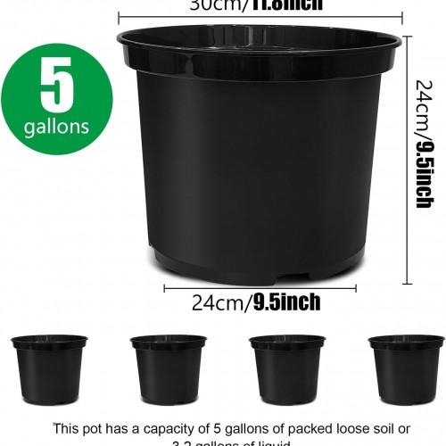 - 5 Gallon Plastic Pots 5 Pack:12-inch plastic pots with a 5-gallon capacity provide ample space for plant growth(5 gallons of packed loose soil or 3.2 gallons of liquid);this pack includes five pots for handling multiple planting projects simultaneously