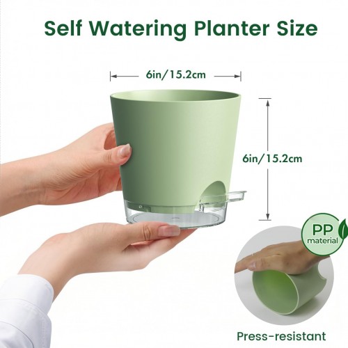 6 inch Self Watering Pots for Indoor Outdoor Plants, 3 Pack Flower Plant Pots with Drainage Holes and Clear Reservoirs, Visible Water Level, Plastic Planters with Wicking Rope, Green