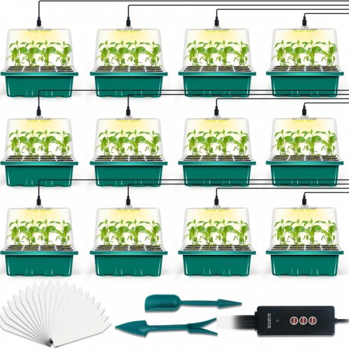6-Set Seed Starter Tray with Grow Light, Seed Starting Trays Kits with Timing Controller Adjustable Humidity Domes Heightened Lids(12-Cells Per Tray)