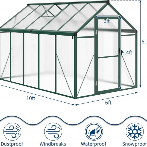 - 【Resilient Construction】Designed to endure challenging weather, our greenhouse features 720g/m² polycarbonate panels and a solid aluminum steel frame. This design ensures stability and protection during heavy rain and gale. Keep your plants safe and thriving in a reliable greenhouse built to last.