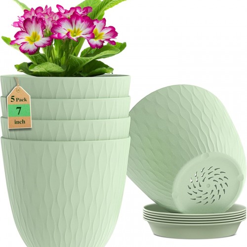 7 inch Plant Pots, 5 Pack Flower Pots with Drainage Holes and Saucers for Indoor Plants, Plastic Planters with Water Ripple for Small Garden House Plants, Nursery Pots for Succulent, Colorful