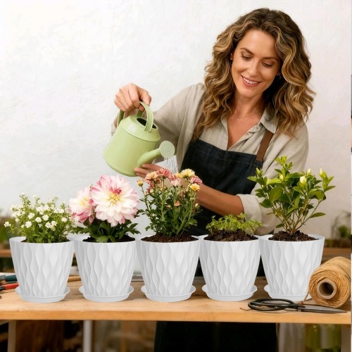 7 Inch Plant Pots 5 Pack, Plastic Flower Pots with Drainage Holes Saucers, Indoor Outdoor Planters for Plants, Lightweight Durable,White