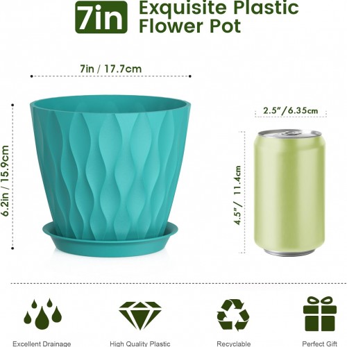 7 inch Plant Pots for Indoor Outdoor Plants, 5 Pack Thick Flower Pots with Drainage Holes and Saucers, 3D Modern Wave Texture Plastic Planter Pots for Nursery and House Plants, Blue Green