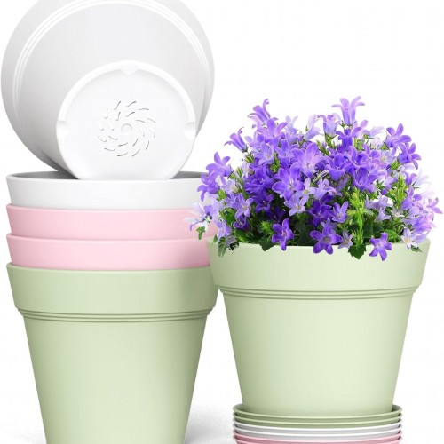 7 Inch Thick Plastic Plant Pots with Drainage Holes and Trays – 6 Pack Nursery Pots for Indoor & Outdoor House Plants, Seedling Starter Planters for Garden Flowers, White
