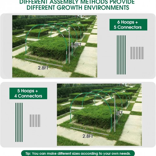 - 【Easily Assemble】No tools required! Simply combine 8 or more hoops with connectors, bend the assembled hoops and insert them into the soil, Then just secure the greenhouse covering with clips. You can make a suitable growing tunnel for your plants according to your needs.