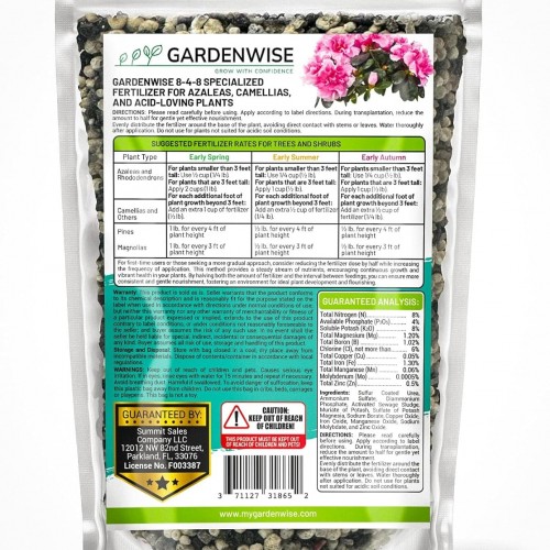 - 🌺 VIBRANT BLOOMS & ROBUST GROWTH: Enriched with essential nutrients like magnesium, iron, and manganese, GARDENWISE 8-4-8 is ideal for preventing chlorosis in acid-loving plants. It’s perfect for azaleas, camellias (camelia), rhododendrons, hydrangeas, and all acid-loving plants including magnolia trees, evergreens, and blueberries.