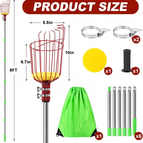 8 FT Fruit Picker Pole with Basket, Adjustable Fruits Picker Catcher Tool for Apple Mango Avocado Lemon Fig Citrus Orange Fruit Picker