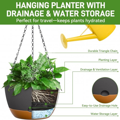 8 Inch Hanging Planters for Indoor & Outdoor Plants (2 Pack) – Self-Watering & Drainage Flower Pots with 2 Kinds of Plant Hangers for Home Decor & Garden (Deep Gray, 8 in)