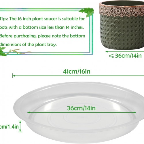 - Thickened & Durable Plastic Material: 16 Inch plant saucer is made of thicker and stronger plastic, which is sturdy and durable. Plant trays for pots will not fade, crack, or leak in sunlight. Plant saucers for indoors are stronger than other materials and can hold heavy-duty flower pots. If you have any dissatisfaction, please contact us and we will give you a satisfactory answer