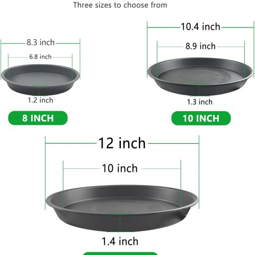 - 【Multi-Size Set for Versatile Use】 Includes 9 plant saucers: 3 × 8″ (20.5 cm OD / 17 cm ID / 2.7 cm H / each 100 g), 3 × 10″ (25.5 cm OD / 21.5 cm ID / 3 cm H / each 135 g), and 3 × 12″ (29.5 cm OD / 25.5 cm ID / 3.2 cm H / each 163 g). Perfect for different flower pots and gardening needs.