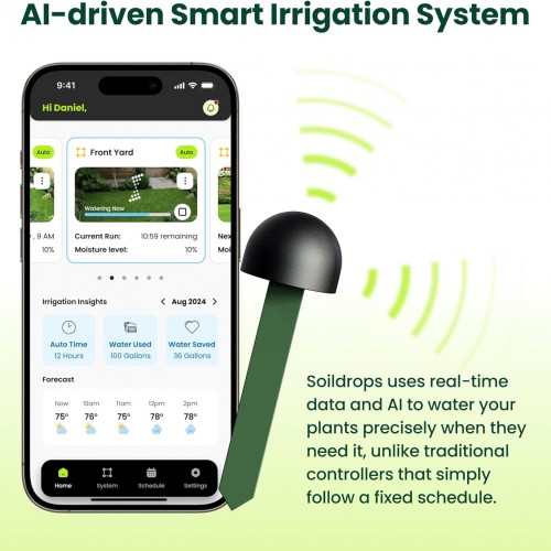 - AI-POWERED SMART WATERING – Soildrops uses advanced AI technology to automatically adjust your watering schedule based on real-time soil moisture, weather forecasts, and seasonal changes. The system works seamlessly without manual effort — however AI functionality REQUIRES pairing with the SMART SENSOR for full operation