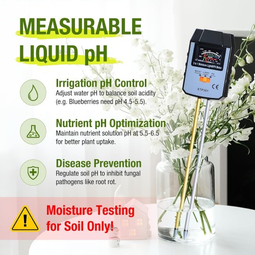 - [Liquid pH Measurement] Our soil pH tester designed to measure not just soil pH but also liquid pH. Perfect for controlling irrigation water pH, this feature helps you maintain the ideal soil acidity for your plants. For instance, blueberries thrive in acidic soil with a pH of 4.5-5.5. Proper pH levels enhance nutrient absorption and prevent plant diseases. Note: Only the probe should be immersed in liquids.