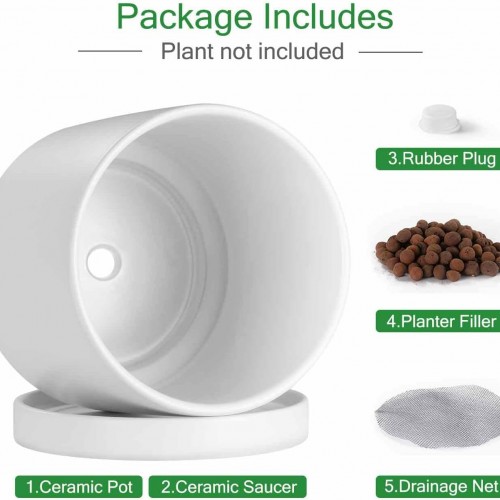 - Package Includes: An 8.3″D x 7.1″H Ceramic planter pot with a round drainage hole, an 8.3″D x 1″H ceramic saucer, a rubber plug, a drainage net and planter filler (Plant is not included).