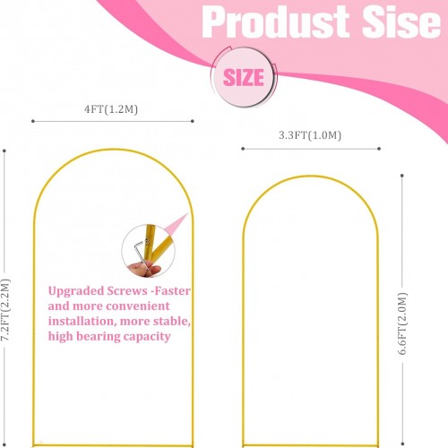 - 【Wedding Arch Stand Set】2 Pieces wedding arch set perfectly matched with two sizes, for meeting your different needs. The three sizes measures 7.2x4FT (HxW) and 6.6×3.3FT (HxW). You can combine the decoration changes according to the actual situation of the party, flexible and free collocation.