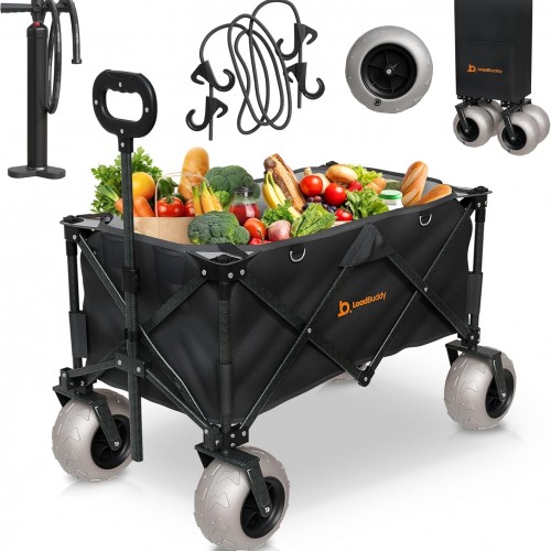 Beach Wagon with 9″ Balloon Wheels & Fishing Rod Holders – Foldable Cart for Sand with Inflatable Tires, Bonus Pump & Spare – Heavy Duty Utility Wagon – Black/Black