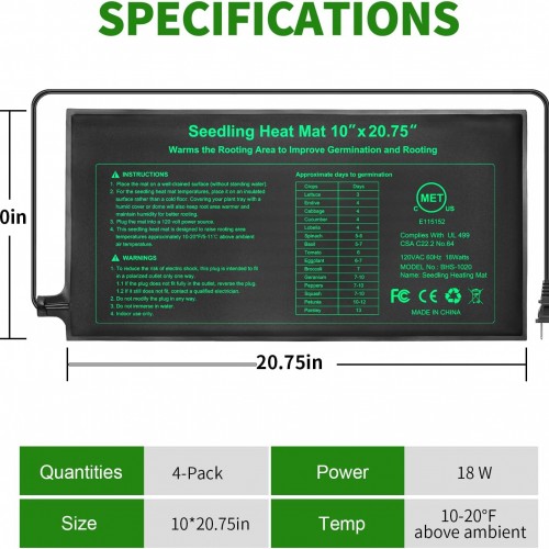 - ✿【Spec.】 Bestio seedling plant starter heat mat, 120V 60Hz 20W, 10” * 20.75”, 4 pack. perfect size to fit standard seed germination tray and carboy or bucket fermentor.