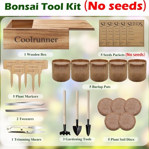 - 𝐁𝐨𝐧𝐬𝐚𝐢 𝐏𝐥𝐚𝐧𝐭 𝐆𝐫𝐨𝐰𝐢𝐧𝐠 𝐊𝐢𝐭:you will receive a bonsai tree kit, which includes 1 wooden box, 2 Tweezers, 5 burlap grow bags, 3 gardening tools, 5 plant soil discs, 5 plant markers, 1 trimming shears, and 5 seeds packets(𝐍𝐨 𝐬𝐞𝐞𝐝𝐬)