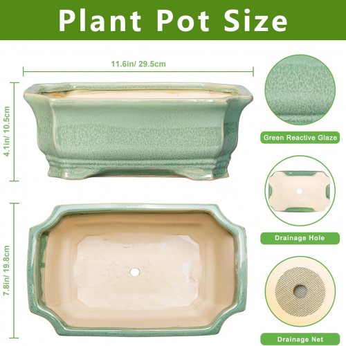 Bonsai Tree Pot 11.6 Inch – Ceramic Succulent Pots, Bonsai Planter for Indoor Outdoor, Decorative Plant Pot with Drainage Hole, Rectangular Flower Pot, Home Garden Decor, Garden Gifts, Green