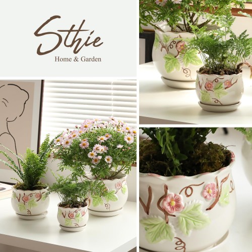 Ceramic Plant Pots with Drainage Holes and Saucers, Round Flower Pots for Indoor Plant, 3.9/5.2/6.7 Inches Small Flower Planters Set of 3