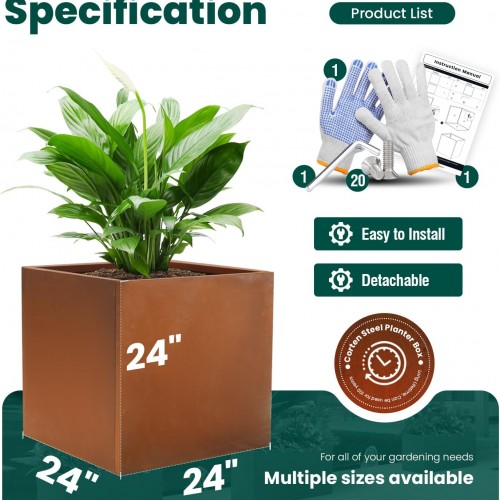Corten Steel Planter Box Large Outdoor Planter Square Cube Planters Rustic Metal Garden Flower Pot 24 Inch Durable Antique Detached for Commercial Residential Patio Deck and Yard