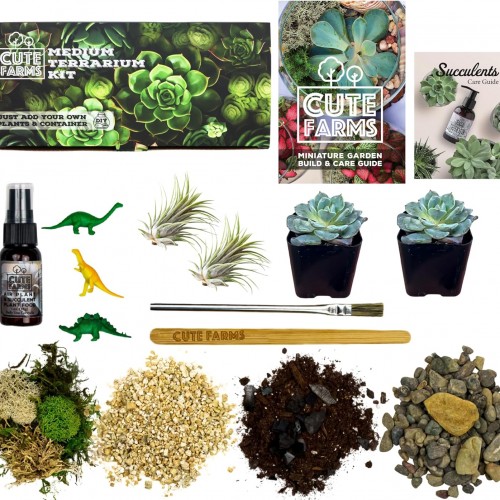 - VALUE – The Medium Terrarium Kit includes a 4.5’’x 2.25’’ container of Moss (Reindeer Moss, Forest Moss & Lichen), 4.5’’x 2.75’’ Potting Soil Blended with Activated Charcoal, 4.5”x 1.75” Gardening Vermiculite, 4.5”x 1.75” Pea Pebbles & River Stones, 1 oz fl Plant Food, Bamboo Tongs, Natural Hair Brush, (3) Miniature Dinos, Succulent Care Guide, Build & Care Guide, and Cute Farms Sticker. Save when compared to buying individual materials.