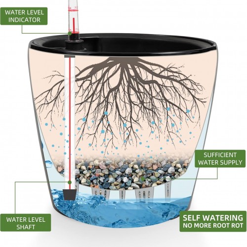 - NEVER MISS WATERING AGAIN – The hydroponic device keeps water ready, then watering time is at your discretion on the gauge. The design of drainage plug and spillway hole is to avoid cycles of overwatering and underwatering, pull out the plug to drain the excess water on rainy days outdoors. The sufficient water supply system enables double the water-efficient than conventional pots. Don’t be anxious about missing watering while you enjoy a long term holiday on a journey or travel outside