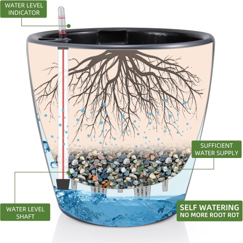 - NEVER MISS WATERING AGAIN – The hydroponic device keeps water ready, then watering time is at your discretion on the gauge. The design of drainage plug and spillway hole is to avoid cycles of overwatering and underwatering, pull out the plug to drain the excess water on rainy days outdoors. The sufficient water supply system enables double the water-efficient than conventional pots. Don’t be anxious about missing watering while you enjoy a long term holiday on a journey or travel outside