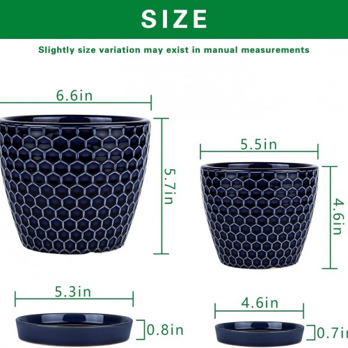 Docrin Ceramic Plant Pots Indoor, 6.6 + 5.5 Inch Planters with Drainage Holes and Saucer for Home/Office – Set of 2 /Blue Honeycomb