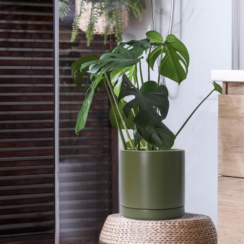 D’vine Dev 10 Inch Ceramic Planter Pot with Drainage Hole and Saucer, Indoor Cylinder Round Planter Pot, Olive, 94-O-E-J