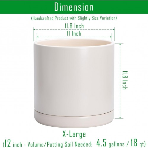 D’vine Dev 12 Inch Ceramic Planter Pot with Drainage Hole and Saucer, Indoor Cylinder Round Planter Pot, Oatmeal, 94-O-F-8