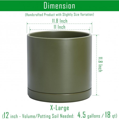 - X-Large 12 Inch Planter Pot: 11.8″ Diameter x 11.8″ H, olive color. Potting Soil Needed: 4.5 gallons / 17 qt.